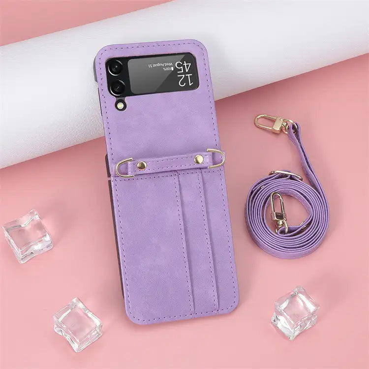 Entdecken Sie unsere hochwertige faltbare Schutzhülle für das Samsung Galaxy Z Flip 3 und Z Flip 4 – erhältlich in verschiedenen stilvollen Farben wie Schwarz, Braun, Violett, Pink und Grün.
